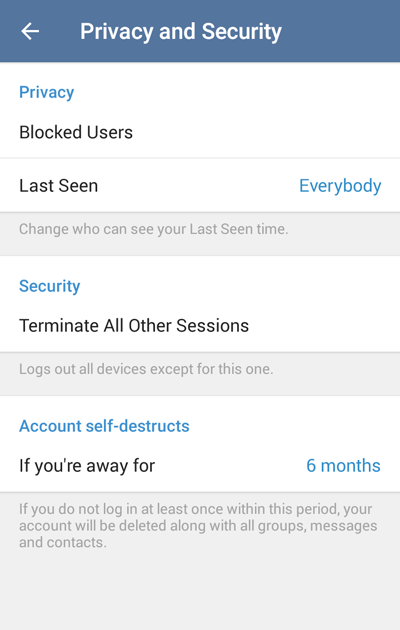 From now on, if you stop using Telegram and do not login for at least 6 months, your account will be deleted along with all messages, media, contacts and every other piece of data you store in the Telegram cloud. You can change the exact period after which your inactive account will self-destruct – with options ranging from 1 month to 1 year.