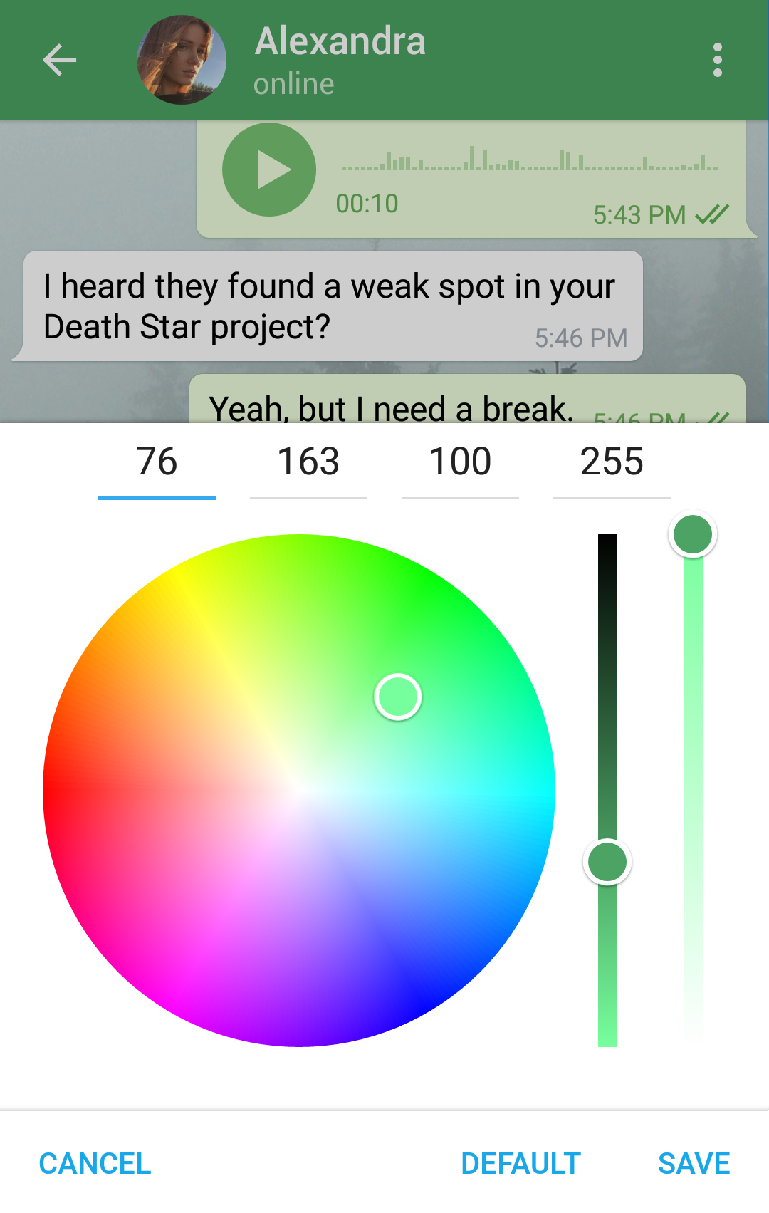 Just like stickers and bots, Telegram themes are part of an open platform, so anybody can create a theme and dazzle the world with new colors and backgrounds. Here's another example of a theme created by our users: