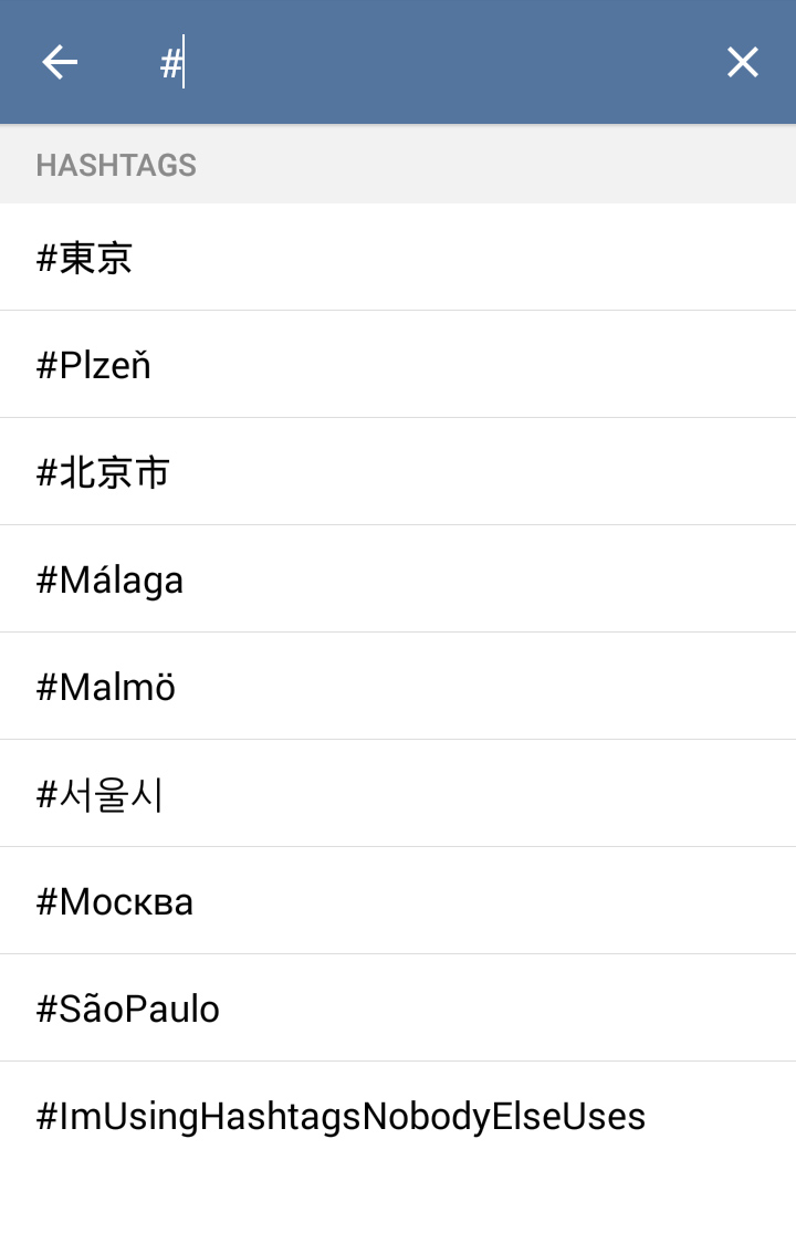 Hashtags now support non-latin characters on both mobile platforms, and what is more important, recently used hashtags will be instantly suggested when you type the # symbol. This makes them much more usable.
