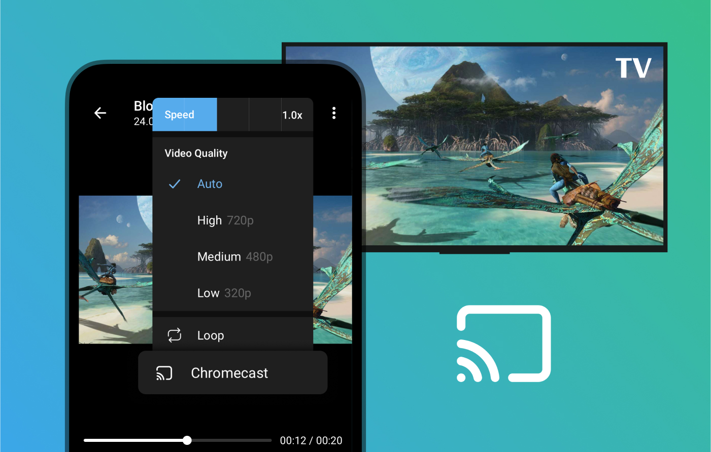 جهت استریم در کروم‌کست، یک ویدیو را باز کرده، روی آیکون تنظیمات بزنید و Chromecast را انتخاب کنید.