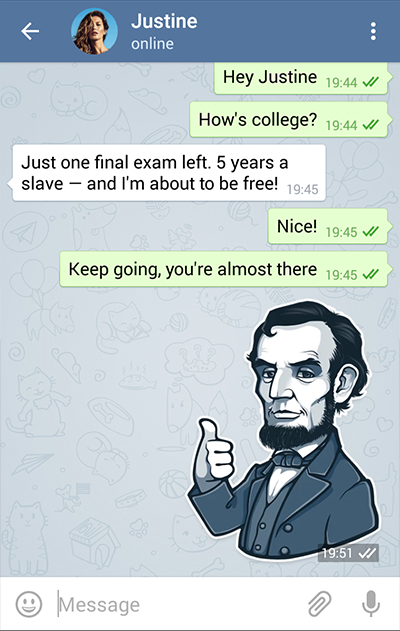 Telegram stickers are grouped around emotions, not characters. They do not clutter the interface, but are shown only when they are relevant – you will see a list of emotionally corresponding stickers whenever you start a message with an emoji. All our stickers are and will be completely free, and you can always create and share your own stickers.